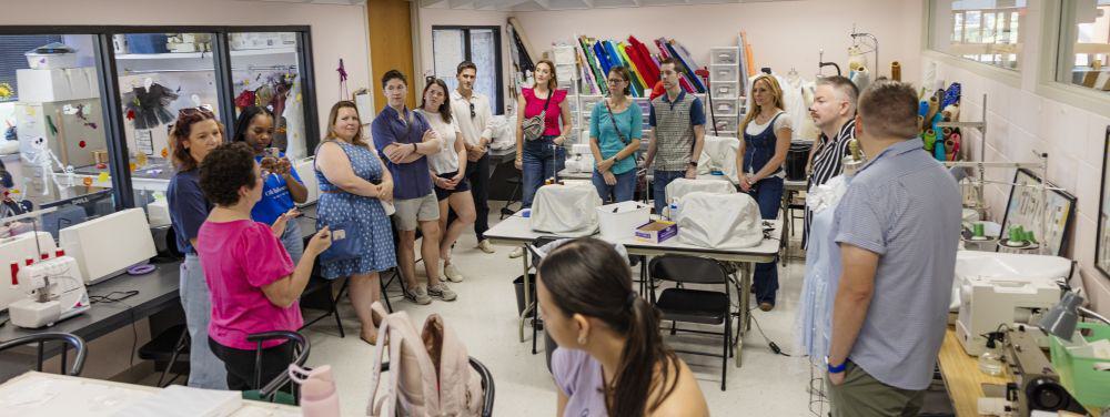 The late morning was a whirlwind of "before and after." Dance Associate Dean Susan Cosby walked them through the Ann Lacy School of American Dance and Entertainment. In the costume studio and nearby storage area, the sight of thread and tulle led to questions about whether certain sequined adornments from their student days still survived through decades of production (in fact, some have). They marveled at the new Dean John Bedford Video Dance Studio while current students practiced and were impressed by the opportunities afforded by the Children's Dance Academy. “That’s real teaching,” someone from the group said. “Not just pretending to be a child in a class.”